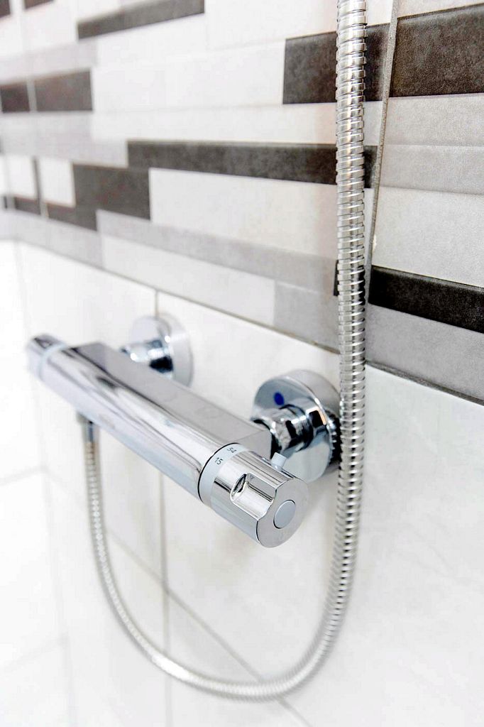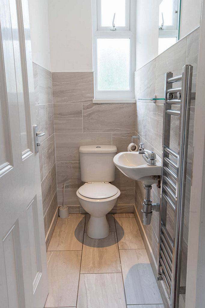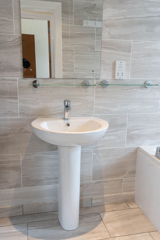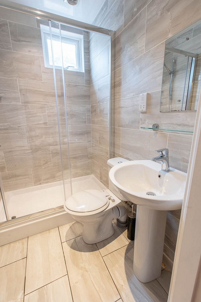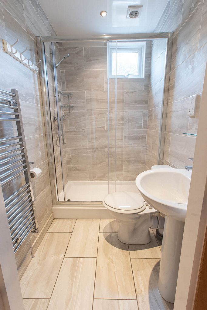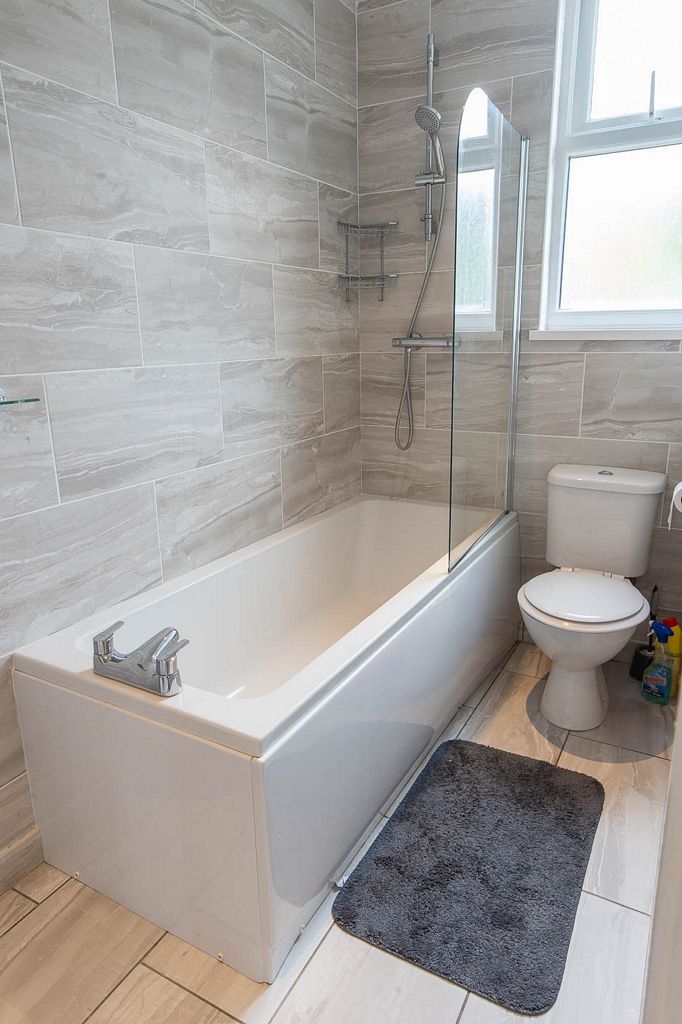 A fully-tiled shower room including toilet is provided downstairs. Upstairs, there is a bathroom including bath with shower over and toilet, and a further a separate toilet.