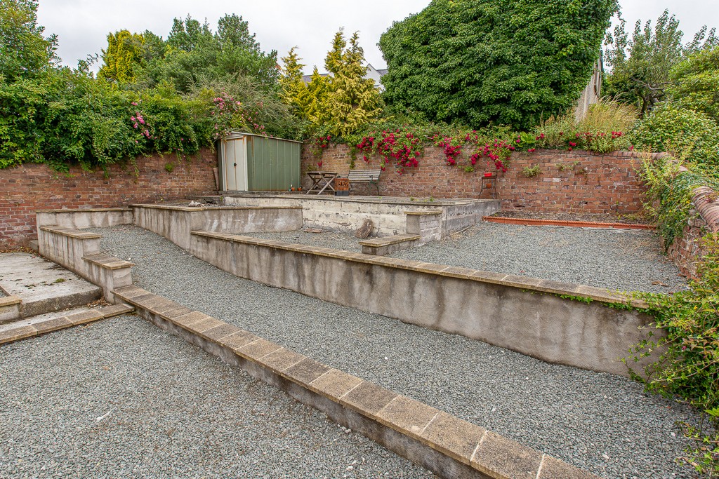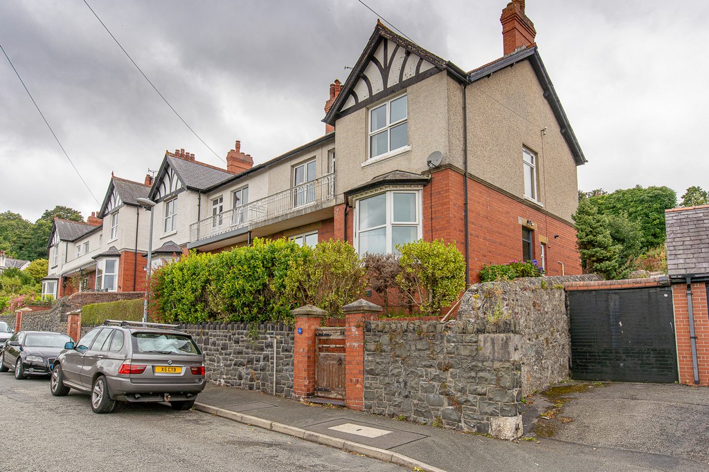A large garden includes a patio area with seating, and a storage shed for bikes. The house overlooks Bangor harbour with stunning views across to the mountains of Snowdonia